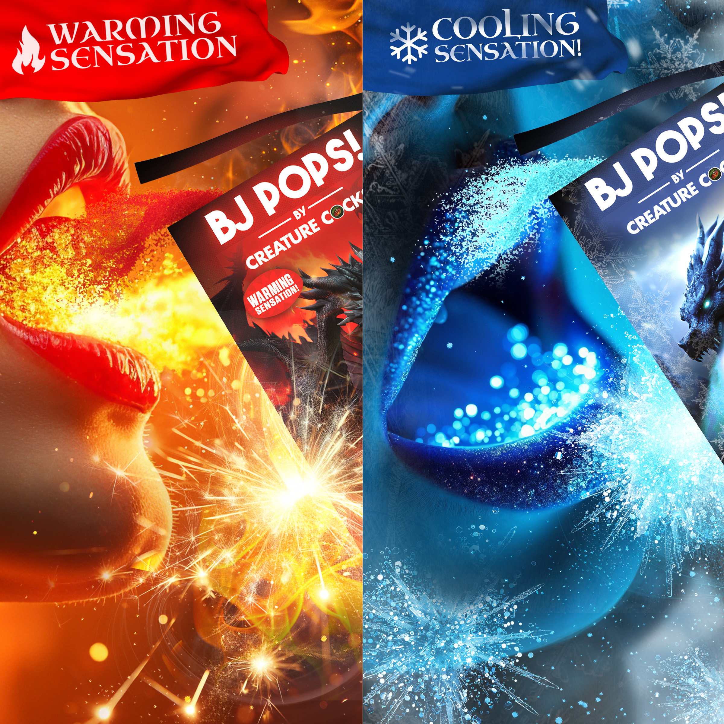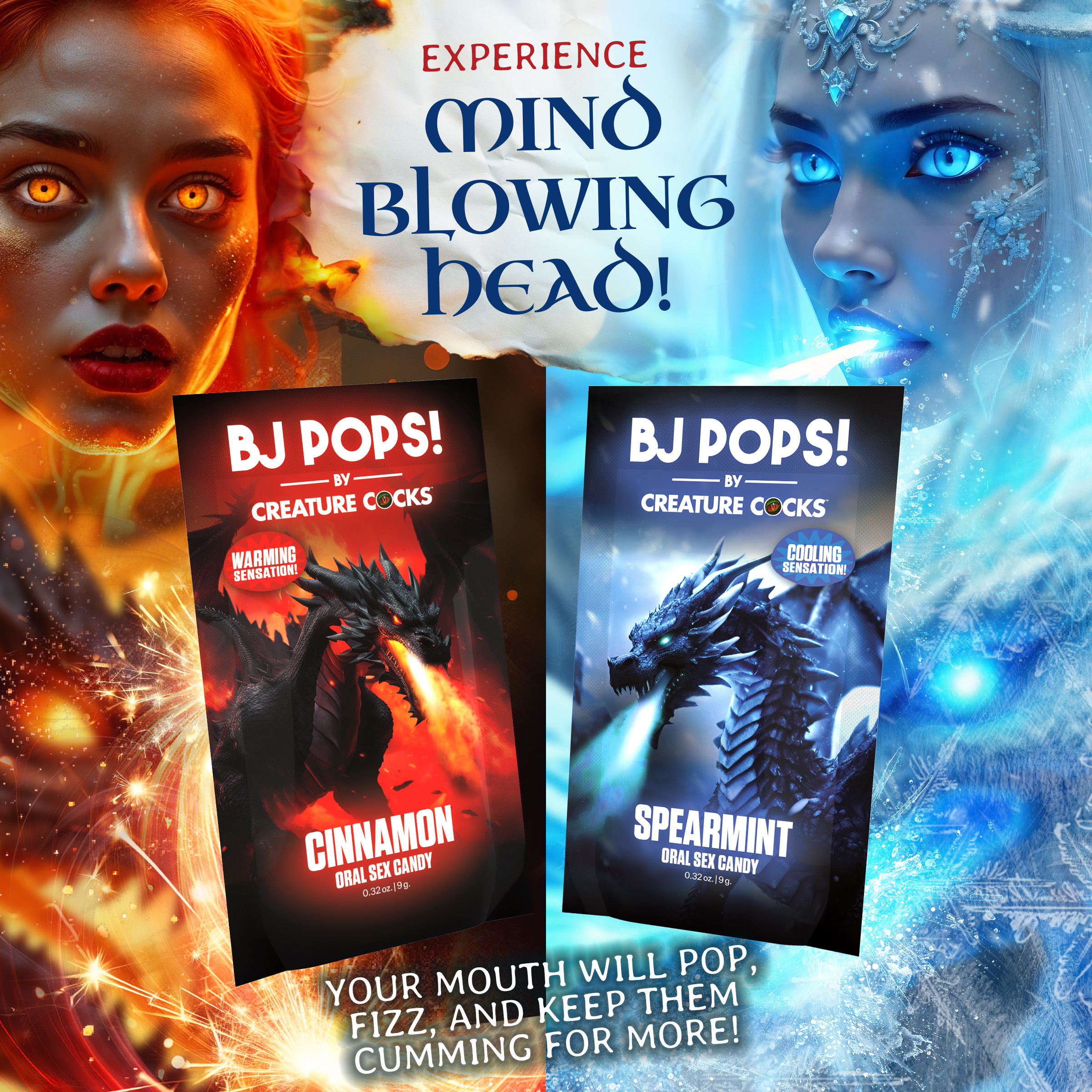 Display your BJ Pops! Candy with two fire and ice dragons on the front! The eye-catching display holds 24 pieces for clients and customers to grab easily, purchase, and enjoy! Encourage them to indulge in a playful, nostalgic candy with an adult twist. Once this candy is exposed to water or saliva, these sizzling, fizzing, popping candies stimulate the mouth and any other body-part they come into contact with! Enhance oral sensations and enjoy the warming cinnamon or cooling spearmint flavors!