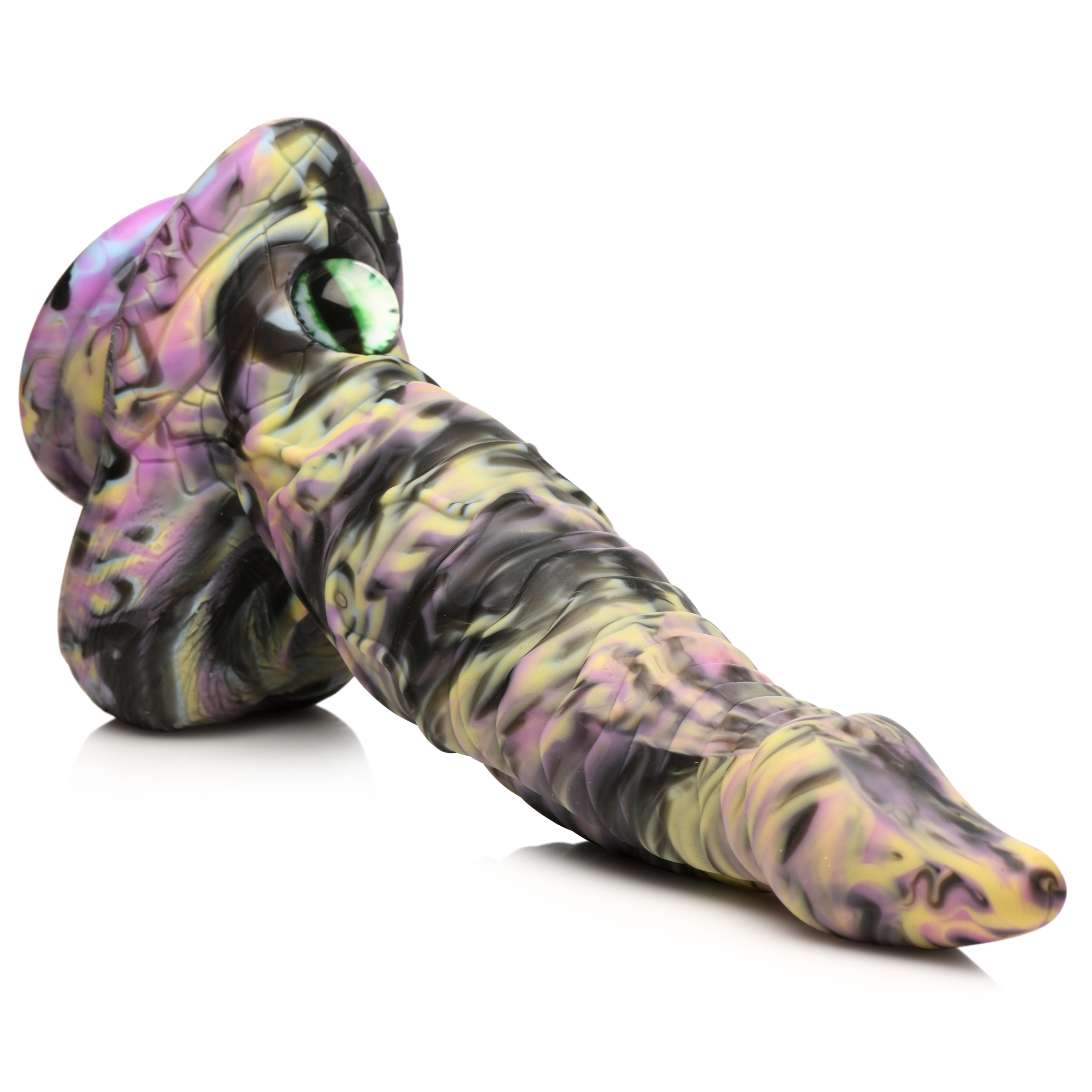 This Creature Cocks dildo comes from one of the many faraway lands of myth and fantasy. This yellow, pink and black rod has a tapered, textured shaft that is firm and flexible with a good amount of squish around the core so you push it deep into your sensual caverns. The serpentine-like body of this sexy shaft has a long, tapered head with ribbed shaft, popping veins, and an eye at the base. The vibrant green, glass cat-eye makes this Cyclops monster rod an intimate and mystical ride. Made out of premium, phthalate-free silicone it is body-safe and best used with water-based lubricants. The strong, suction-cup base allows you to enjoy hands-free rides when placed on any flat surface. It’s also harness compatible so you can strap it to your partner or to a chair or bench. To wash it simply rinse in warm water and mild soap, then spray with a toy cleaner before letting it air dry.