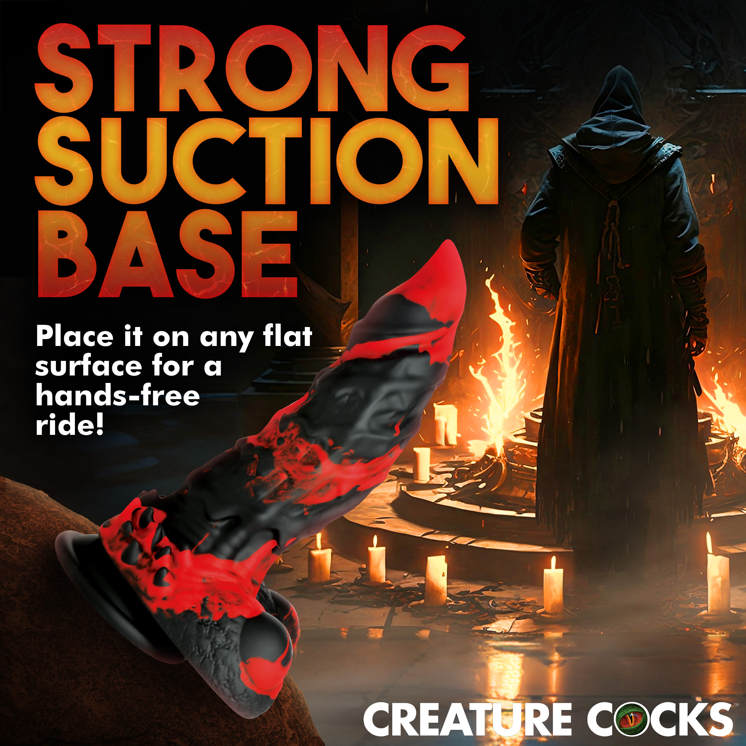 Get the most out of your deep, penetration play with this fiery, demon dong! With bold red and black colors it has a spiky, tapered tip, ropey veins that add texture all along the thick shaft, and a pair of big balls to bounce on. The ropey veins give it a liquid look as if it is melting or wet with heavy, thick fluids and there are round, spiked nubs that jut out at the base. Made out of premium, flexible, phthalate-free silicone, this dong is body-safe and best used with water-based lubricants only. Enjoy hands free rides due to the strong suction cup base! Invite a partner to indulge in kinky cosplay or fantasy roleplay and use their favorite harness to transform this dong into a strapon! Afterward, make sure to wash it with warm water and mild soap, then spray it with a toy cleaner and air-dry. Keep out of direct sunlight and heat.