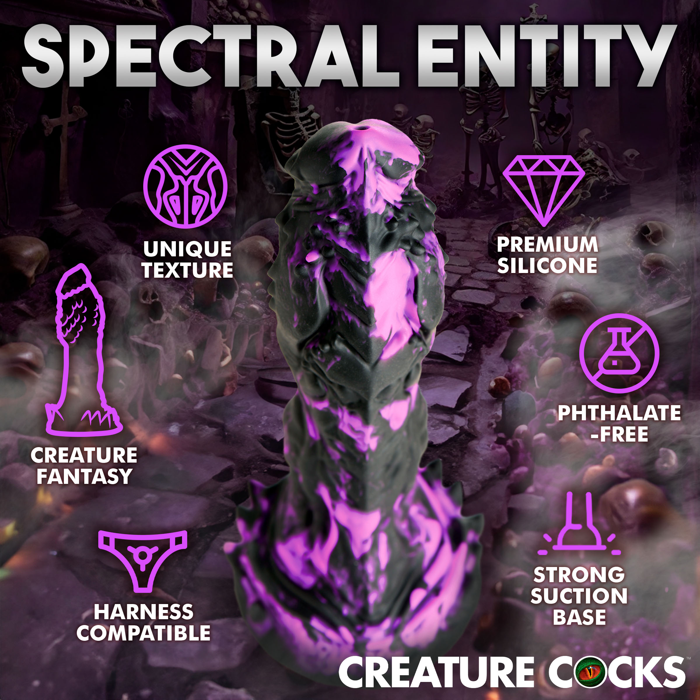 When death comes for you, you better wish that the Reaper is this hot! This purple and black dildo is menacingly large with textured ridges, nubs, grooves and spikes on it. The edge of the corona is rimmed with spiked nubs and is wider at the top then the middle. The wide base provides powerful suction so you can go hands-free by placing it on any flat surface to keep it in place. You can also combine it with a compatible strapon harness for pegging play! Made out of premium, phthalate-free silicone, it has a firm core and soft, silky surface. Explore every sci-fi, fantasy, roleplay or cosplay scene you want with this epic adult toy! Use only with water-based lubricants for best results. After play is over, wash the dildo with warm water and soap and use a toy cleaner to spray clean. Wipe dry and store in a cool, dark place out of direct sunlight.